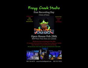 Open House at Frogg Creek Studio on February 28, 2026 from 11 am - 7 pm. RSVP quickly to get a great slot for your FREE recording! BBQ hot dogs & Refreshments included.